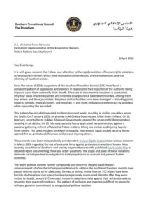 يؤسفني أن ألفت انتباهكم، ببالغ القلق، إلى التصعيد المتسارع في انتهاكات حقوق الإنسان في جنوب اليمن، والتي أسفرت عن سقوط قتلى من المدنيين، وعمليات احتجاز تعسفي، وإسكات الأصوات الجنوبية.