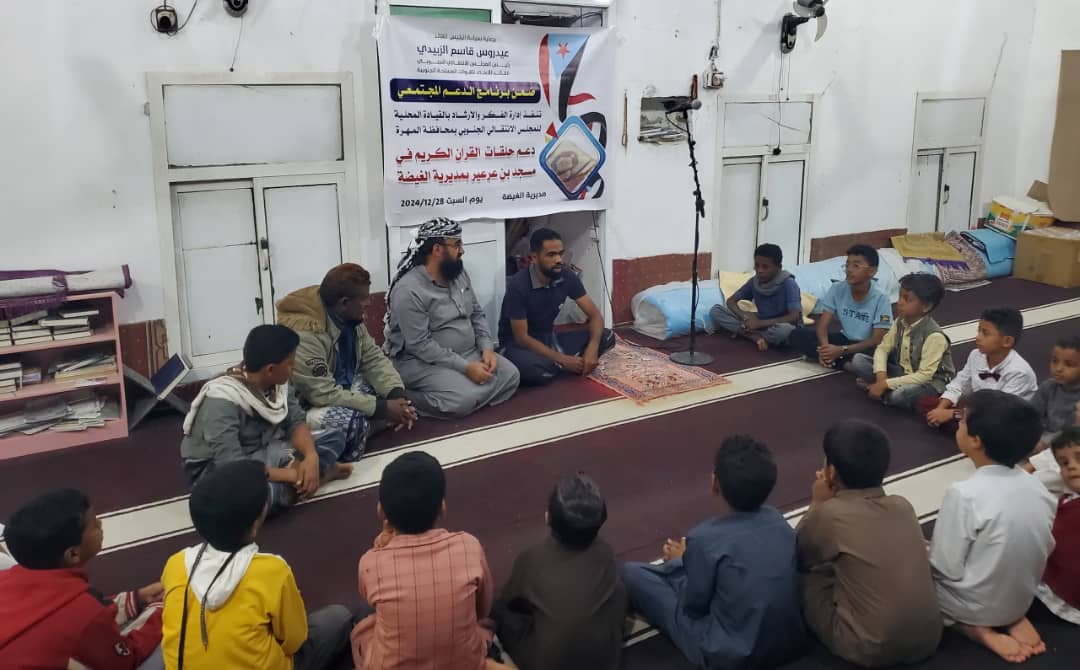 دشنت إدارة الفكر والإرشاد بالهيئة التنفيذية للقيادة المحلية للمجلس الانتقالي الجنوبي بمحافظة المهرة مساء هذة الليلة ، مشروع دعم حلقات القرآن الكريم في مسجد بن عرعير بمديرية الغيضة ، وذلك ضمن برنامج الدعم المجتمعي الذي ينفذه المجلس الانتقالي .