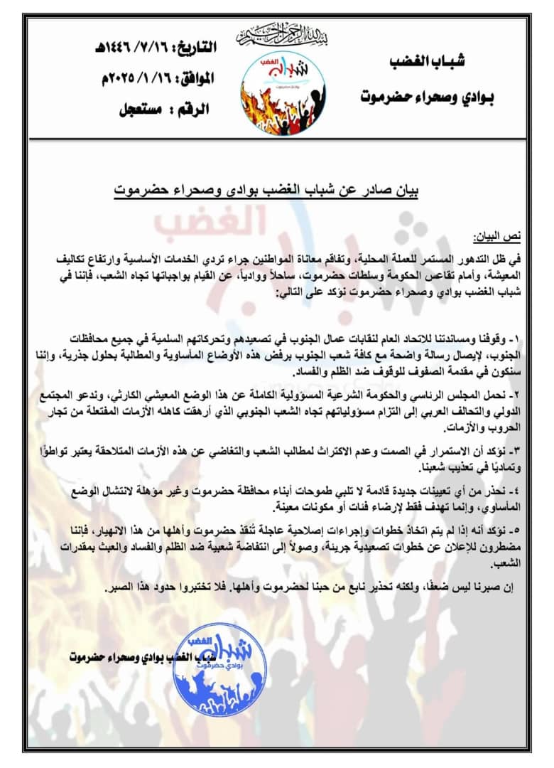 في ظل التدهور المستمر للعملة المحلية، وتفاقم معاناة المواطنين جراء تردي الخدمات الأساسية وارتفاع تكاليف المعيشة، وأمام تقاعس الحكومة وسلطات حضرموت ساحلاً ووادياً عن القيام بواجباتها تجاه الشعب، فإننا في شباب الغضب بوادي وصحراء حضرموت نؤكد على التالي: