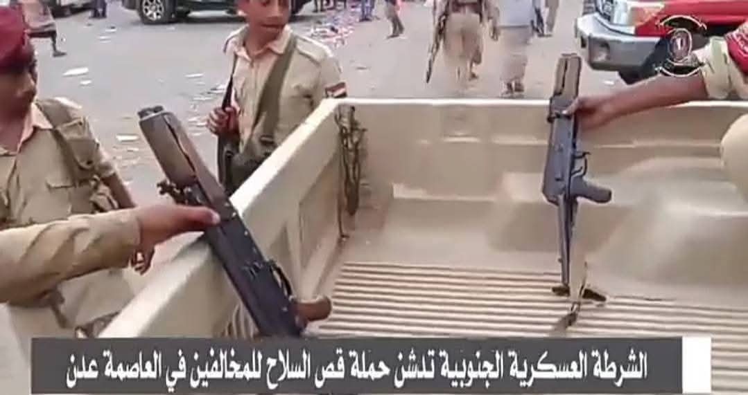 نشيد بالخطوات التي اتخذتها القيادة الأمنية والعسكرية في العاصمة عدن ونفذتها الشرطة العسكرية بقص الأسلحة المخالفة وغير المصرح بها