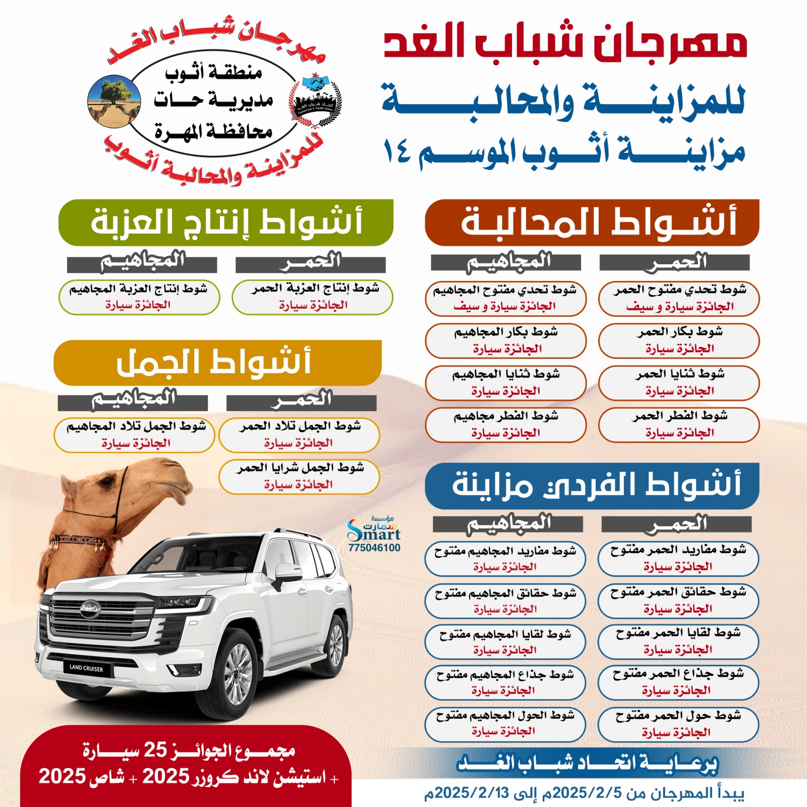 وأوضح الشيخ سالم مسلم بلحاف، رئيس اتحاد شباب الغد، أن مهرجان شباب الغد للمحالبة ومزاينة أثوب الموسم 14 يمثل إحدى أبرز الفعاليات التراثية التي تجمع قبائل محافظتي المهرة وحضرموت ومناطق الحدود، حيث يعزز روح التعاون والتنافس الشريف تحت مظلة التراث الأصيل.