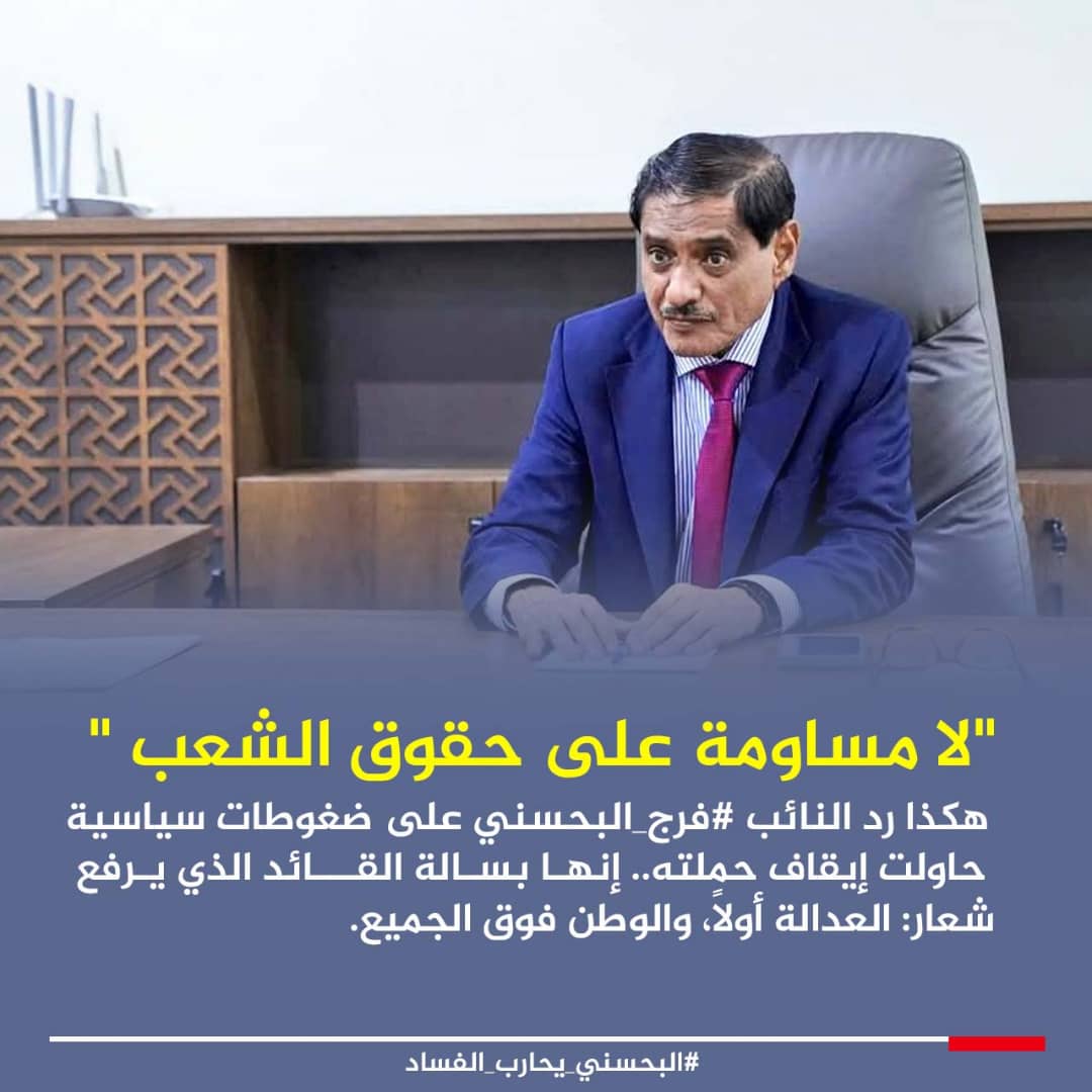 جنوبيون أكدوا على أن الجنوب يرفض كافة أشكال الفساد. مشيدين بجهود اللواء البحسني الرامية إلى تعزيز الشفافية والمساءلة، وتحقيق العدالة والاستقرار في المجتمع. مشيرين بأن نائب الرئيس فرج البحسني كقائد جنوبي صلب يقود معركة ضد الفساد، وتعزيز الالتفاف الشعبي حوله وحول المشروع الوطني الجنوبي الذي يقوده المجلس الانتقالي الجنوبي بقيادة الرئيس القائد عيدروس الزٌبيدي لاستعادة دولة الجنوب كاملة السيادة على حدودها المتعارف عليها دوليا قبل عام 1990م.