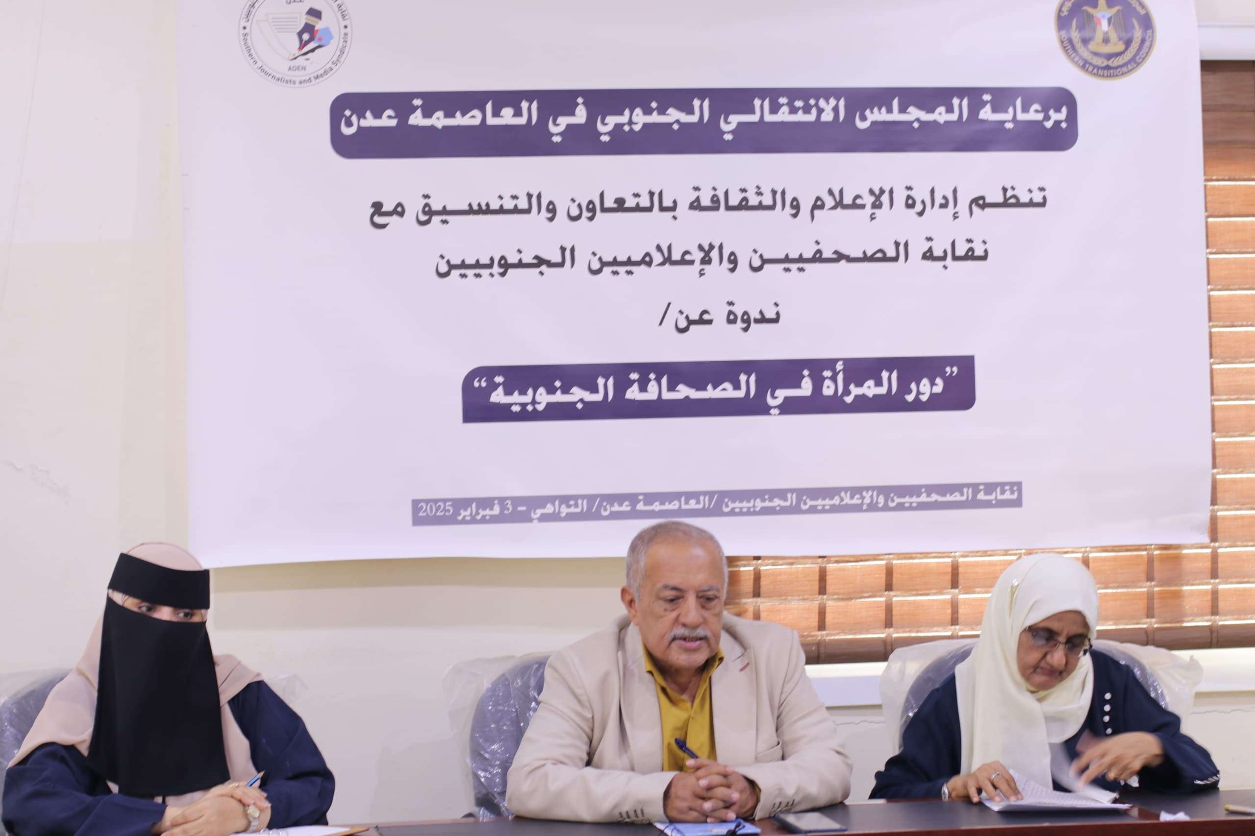 نظّمت إدارة الإعلام والثقافة بالهيئة التنفيذية للقيادة المحلية للمجلس الانتقالي الجنوبي في العاصمة عدن، بالتعاون مع نقابة الصحفيين والإعلاميين الجنوبيين، اليوم الاثنين، في مقر النقابة بمديرية التواهي، ندوة بعنوان “دور المرأة في الصحافة الجنوبية”.