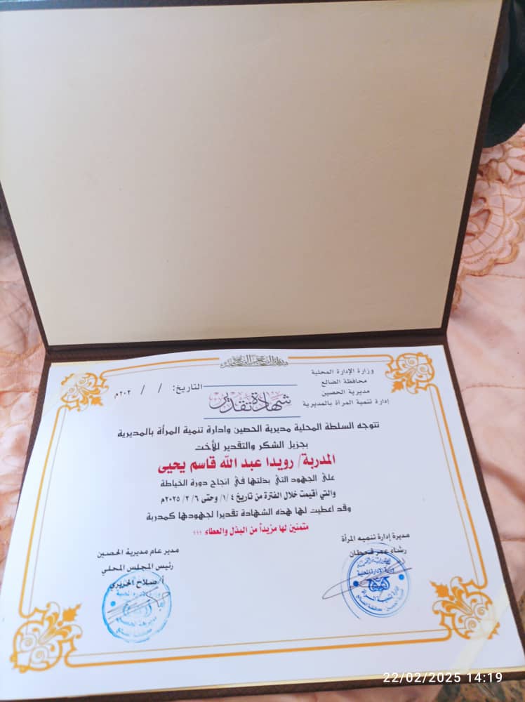 كما قامت الأستاذة رشاء بتكريم مدربة الخياطة بشهادة تقديرية، مثمنةً جهودها وإسهامها الكبير في إنجاح الدورة. وخاطبت المتدربات قائلة: “مع انتهاء هذه الدورة، أود أن أعبر عن امتناني لكل واحدة منكن على التزامكن وجهودكن. لقد كانت هذه فرصة رائعة لتعلم مهارات جديدة ستساهم في تحسين دخل أسركن. إن الخياطة ليست مجرد حرفة، بل وسيلة لتعزيز الاستقلال المالي للأسرة. من خلال ما تعلمتنه، يمكنكن الآن إنتاج ملابس جميلة ومفيدة، مما يساهم في تحسين مستوى المعيشة. استفدن من هذه المهارات لتطوير مشاريعكن الخاصة، سواء عبر بيع الملابس أو تقديم خدمات الخياطة للمجتمع. كونوا فخورات بما أنجزتنه، فكل قطعة تخيطنها تعكس إبداعكن وتدعم أسركن. لا تترددن في تطبيق ما تعلمتنه ومشاركة إبداعاتكن مع الآخرين.”