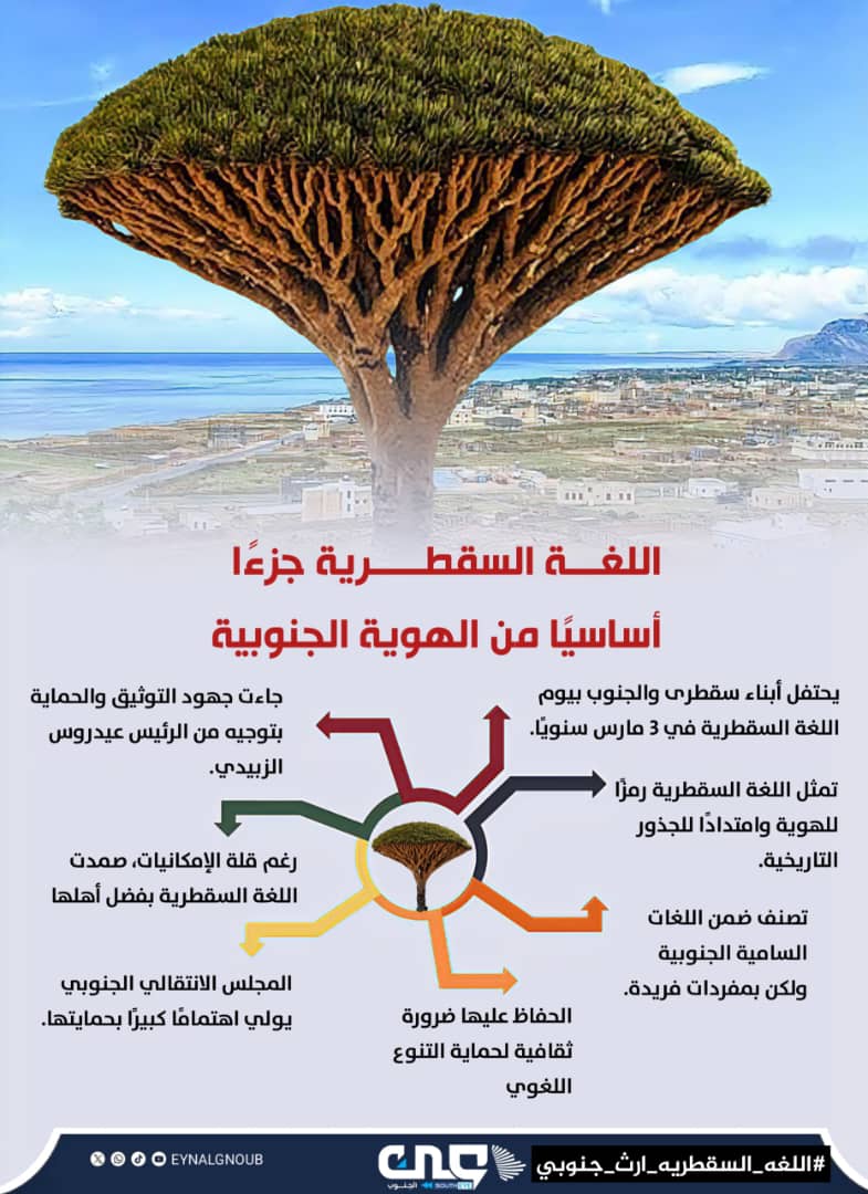 يمثل يوم اللغة السقطرية فرصة لتجديد العهد بالحفاظ على هذا الإرث اللغوي العريق، وضمان استمراريته كجزء من هوية سقطرى والجنوب. فاللغة ليست مجرد كلمات، بل هي هوية شعب، وقصة تاريخ، وروح أمة يجب أن تبقى حيّة للأجيال القادمة.