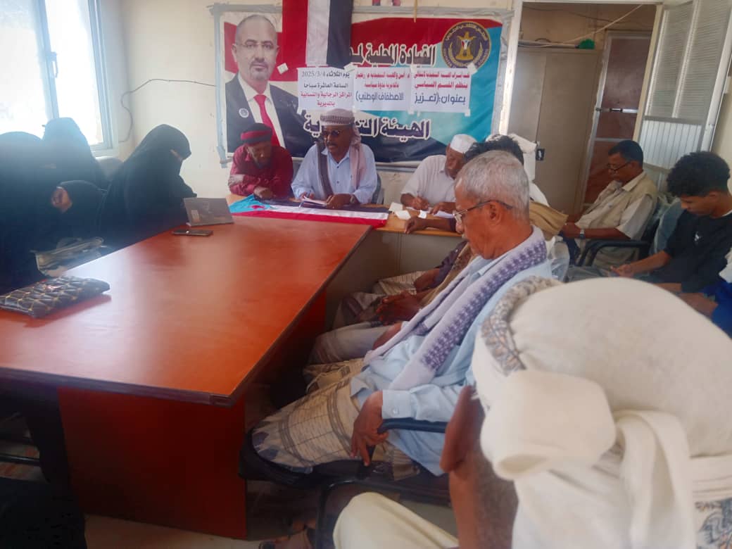 نظم القسم السياسي بالهيئة التنفيذية للقيادة المحلية للمجلس الانتقالي الجنوبي في مديرية زنجبار بمحافظة أبين، اليوم الثلاثاء، ندوة سياسية تحت عنوان “نشر الوعي السياسي وتعزيز الاصطفاف الوطني حول المجلس الانتقالي”، بمشاركة رؤساء اللجان المحلية للمجلس الانتقالي بمراكز المديرية.