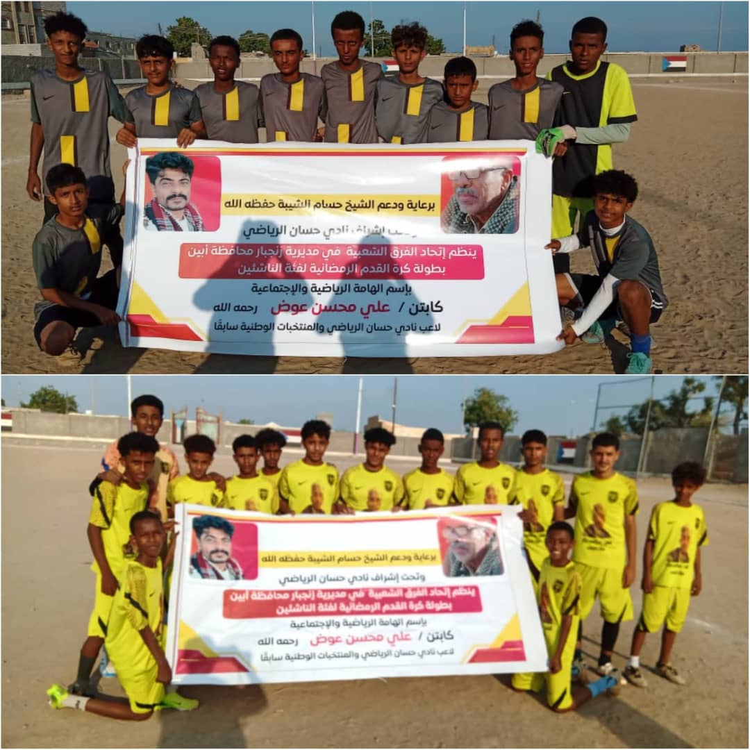 في إطار المنافسات الرياضية الرمضانية، تتواصل مجريات المباريات التنافسية بدوري الهامة الاجتماعية والرياضية الفقيد الكابتن علي محسن عوض، لاعب نادي حسان الرياضي بأبين والمنتخبات الوطنية، ضمن دوري الناشئين للفرق الشعبية في مدينة زنجبار عاصمة محافظة أبين. تقام البطولة برعاية كريمة من قبل الشيخ حسام الشيبة، بمشاركة 15 فريقًا ناشئًا قُسموا إلى أربع مجموعات، وينظمها اتحاد الفرق الشعبية في مديرية زنجبار وتحت إشراف نادي حسان الرياضي.