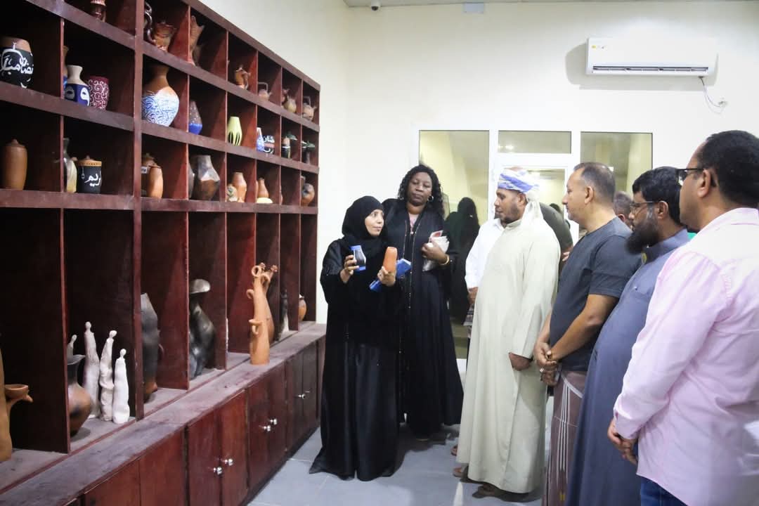 واستمع المحافظ الثقلي إلى شرحٍ مفصلٍ من إدارة المركز حول الدورات التدريبية وورش العمل المقدمة في مجالات حياكة المعاوز، وصناعة الفخار، وسعف النخيل، والرسم، والخط العربي.