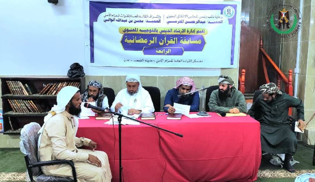 دشّن العميد محسن عبدالله الوالي، القائد العام لقوات الحزام الأمني، المسابقة الرمضانية الرابعة للقرآن الكريم، التي تُنظمها إدارة الإرشاد الديني في الإدارة العامة للتوجيه المعنوي بقوات الحزام الامني، بمشاركة 45 متسابقًا من منتسبي القوات المسلحة والأمن الجنوبي.