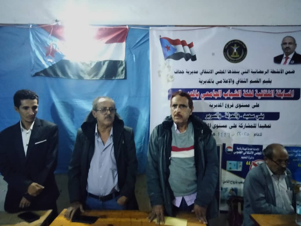 شهدت مديرية جحاف بمحافظة الضالع مساء اليوم الثلاثاء إقامة المسابقة الثقافية العامة على مستوى المراكز التي نظمها قسم الإعلام والثقافة في الهيئة التنفيذية للقيادة المحلية للمجلس الانتقالي بالمديرية، بحضور قيادة الهيئة التنفيذية تقدمهم العقيد عبدالناصر الطبقي، رئيس الهيئة وعدد من الشخصيات المحلية.