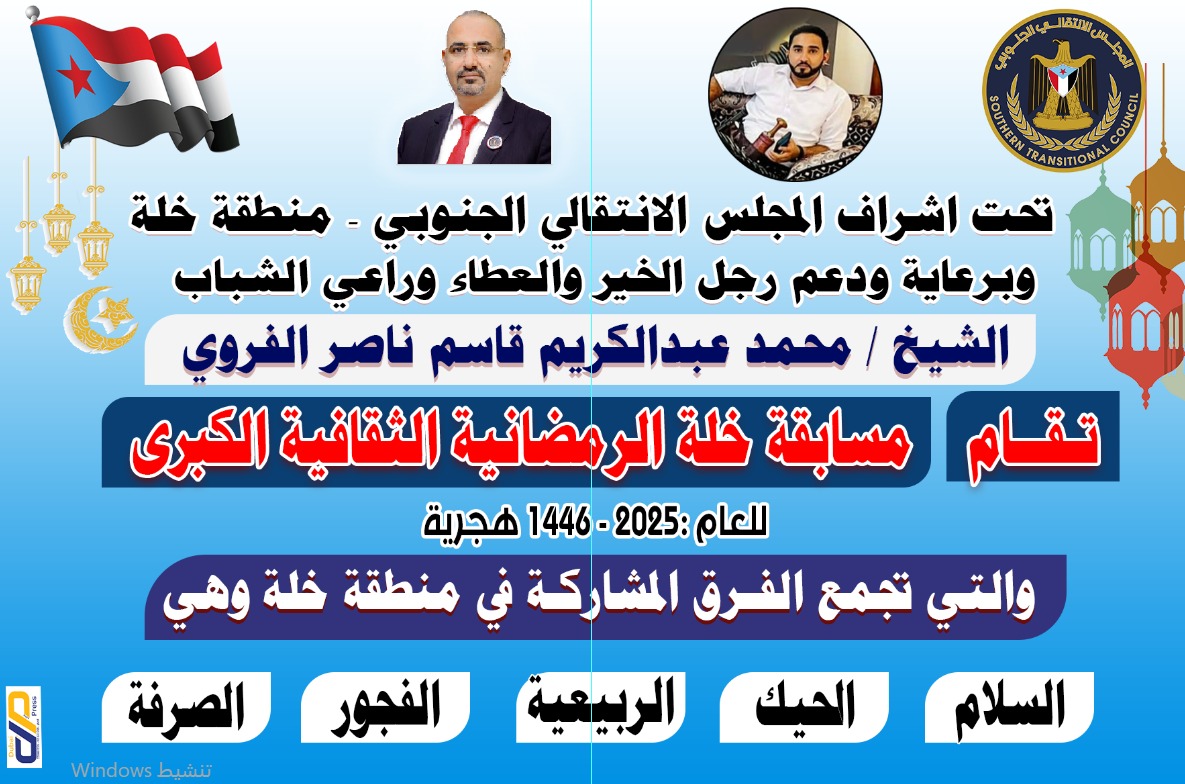 برعاية ودعم رجل الخير والعطاء وراعي الشباب الشيخ محمد عبد الكريم قاسم ناصر الفردوي، وتحت إشراف المجلس الانتقالي الجنوبي ، شهدت منطقة خلة في مديرية الحصين محافظة الضالع مساء اليوم الخميس 13 مارس 2025 م لقاءً حافلاً بالإثارة والتنافس القوي ضمن فعاليات مسابقة “خلّه الرمضانية الثقافية الكبرى”.