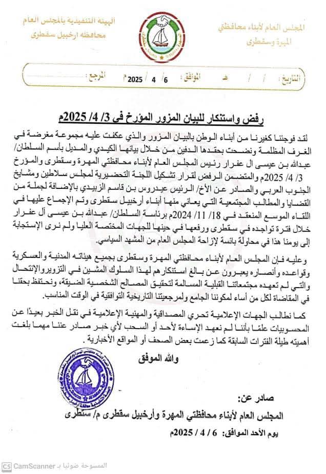 لقد فوجئنا كغيرنا من أبناء الوطن بالبيان المزور والذي عكفت عليه مجموعة مغرضة في الغرف المظلمة ونضحت بحقدها الدفين من خلال بيانها الكيدي والمديل باسم السلطان عبد الله بن عيسى آل عفرار رئيس المجلس العام لأبناء محافظتي المهرة وسقطرى، والمؤرخ 2025/4/3م والمتضمن الرفض لقرار تشكيل اللجنة التحضيرية لمجلس سلاطين ومشايخ الجنوب العربي والصادر عن الأخ الرئيس عيدروس بن قاسم الزبيدي بالإضافة لجملة من القضايا والمطالب المجتمعية التي يعاني منها أبناء أرخبيل سقطرى وتم الإجماع عليها في اللقاء الموسع المنعقد في 2024/11/18م برئاسة السلطان عبدالله بن عيسى آل عفرار خلال فترة تواجده في سقطرى ورفعها في حينها للجهات المختصة العليا ولم نرى الإستجابة إلى يومنا هذا في محاولة بائسة لإزاحة المجلس العام من المشهد السياسي.