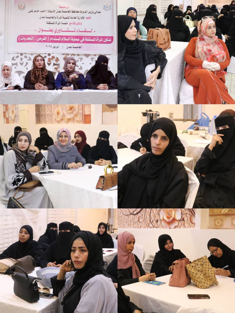 عقد صباح اليوم في العاصمة عدن لقاء تشاوري بعنوان تمكين المرأة المستقلة في عملية السلام المستدام (الفرص _ التحديات)، وجاء اللقاء برعاية معالي وزير الدولة محافظ العاصمة عدن الاستاذ / احمد حامد لملس و تنفيذ الإدارة العامة لتنمية المرأة بالعاصمة عدن بالشراكة مع منصة المرأة المستقلة، قدمت من خلالها ورقتي عمل تضمنتها: