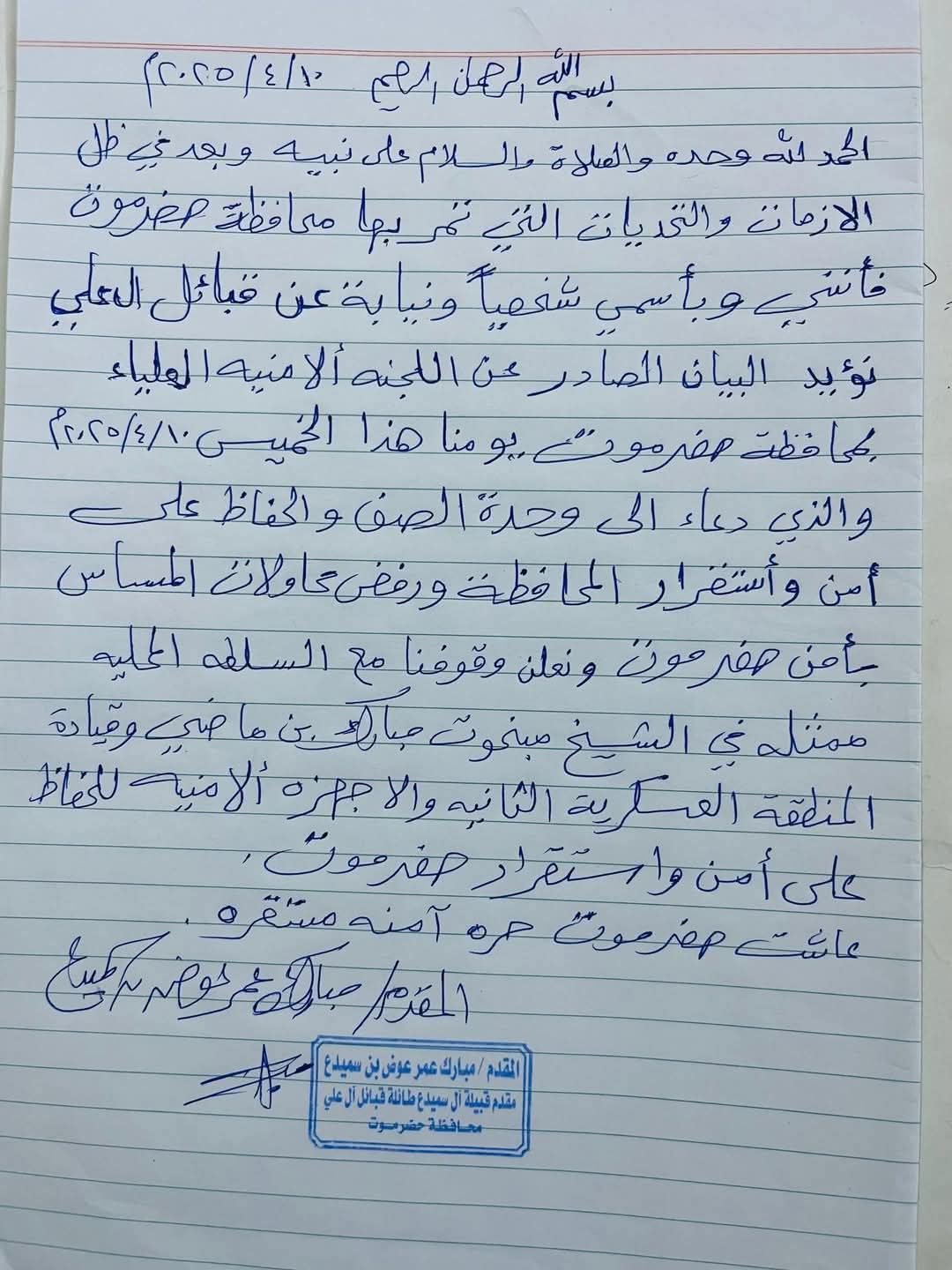 الحمد لله وحده والصلاه والسلام على نبيه وبعد وفي ظل الأزمات والتحديات التي تمر بها حضرموت فأنني وبأسمي شخصيا ونيابة عن قبائل ال علي نؤيد البيان الصادر عن اللجنة العليا بمحافظة حضرموت يومنا هذا الخميس 10 ابريل 2025 والذي دعا إلى وحدة الصف والحفاظ على أمن واستقرار المحافظة ورفض محاولات المساس بأمن حضرموت ونعلن وقوفنا مع السلطة المحلية ممثله في الشيخ مبخوت مبارك بن ماضي وقيادة المنطقة العسكرية الثانية والأجهزة الأمنية للحفاظ على أمن واستقرار حضرموت .. والله من وراء القصد