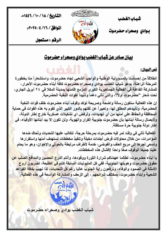 انطلاقاً من إحساسنا بالمسؤولية الوطنية والواجب الشعبي تجاه حضرموت، واستشعاراً منا بخطورة المرحلة الراهنة، يدعو شباب الغضب بوادي وصحراء حضرموت كافة أبناء حضرموت الأحرار للمشاركة الفاعلة في الفعالية الجماهيرية الكبرى المزمع إقامتها بمدينة المكلا في ٢٤ أبريل الجاري تحت شعار “حضرموت أولاً”، والتي تأتي دعماً وتأييداً لقوات النخبة الحضرمية.