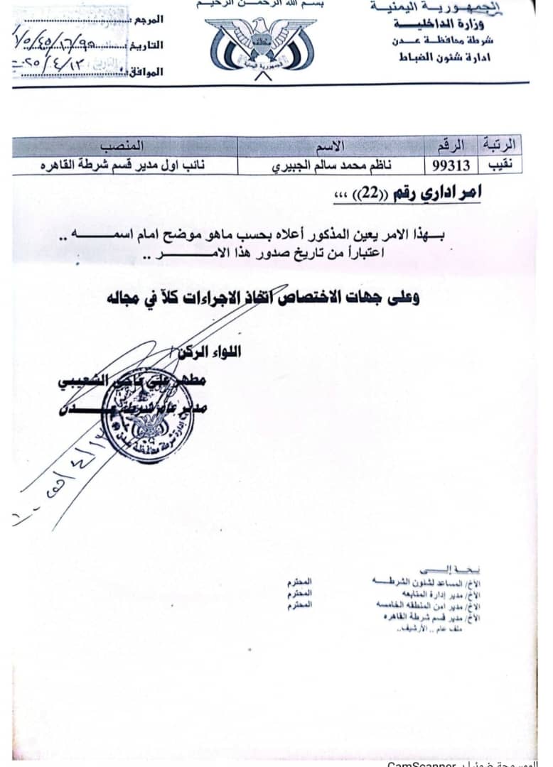 أصدر مدير عام شرطة العاصمة عدن، اللواء الركن مطهر علي ناجي الشعيبي، أمراً إدارياً بتعيين نائب أول لمدير شرطة القاهرة بمديرية المنصورة.