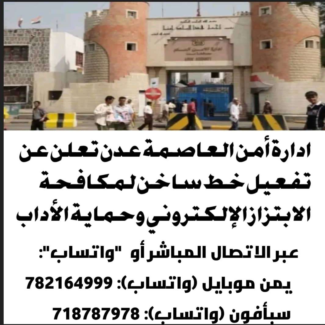 أعلنت إدارة أمن العاصمة عدن عن تفعيل أرقام هواتف ساخنة لقسم الآداب ومكافحة الابتزاز الإلكتروني، وذلك بهدف تسهيل تواصل المواطنين مع الجهات المختصة لحل قضاياهم المتعلقة بهذا النوع من الجرائم المتزايدة.