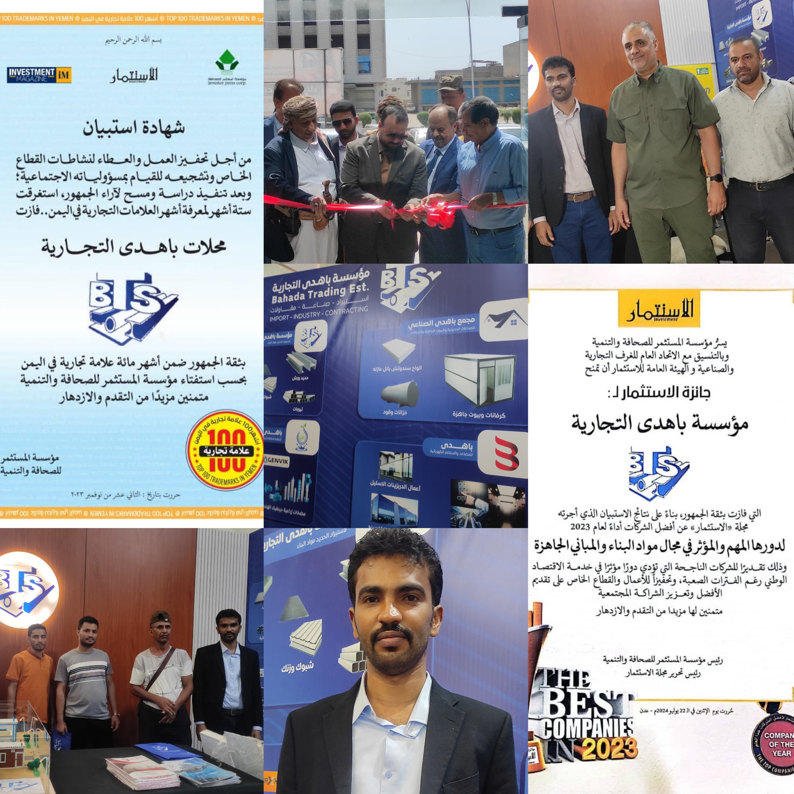 واكد على أن مؤسسة باهدى التجارية للصناعة والاستيراد والمقاولات حصلت على شهادة ضمن افضل 100 علامة تجاريه في اليمن بالإضافة إن مؤسسة باهدى حائزة على شهادة افضل شركة مواد بناء وبيوت جاهزه.