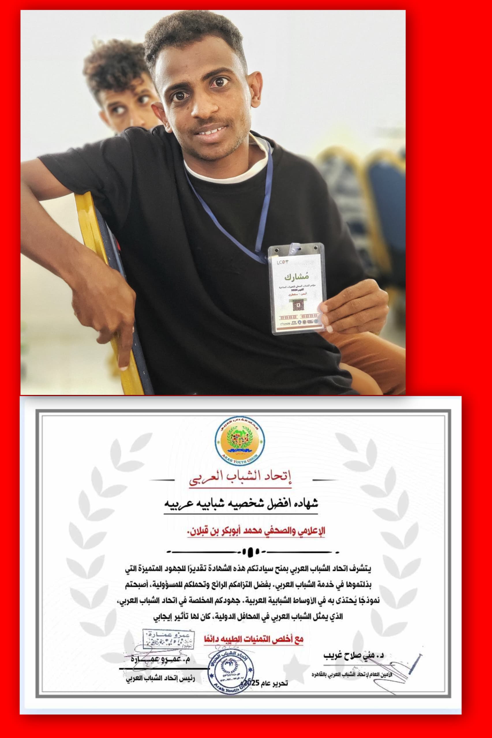 في إنجاز عربي مشرّف يعكس طاقات الشباب اليمني المبدع، تُوّج الإعلامي والصحفي محمد أبوبكر بن سالم بن قبلان السقطري بجائزة أفضل شخصية شبابية عربية لعام 2025م، والتي يمنحها اتحاد الشباب العربي تقديرًا لعطائه الإعلامي اللافت، وجهوده البارزة في خدمة قضايا الشباب والمجتمع.