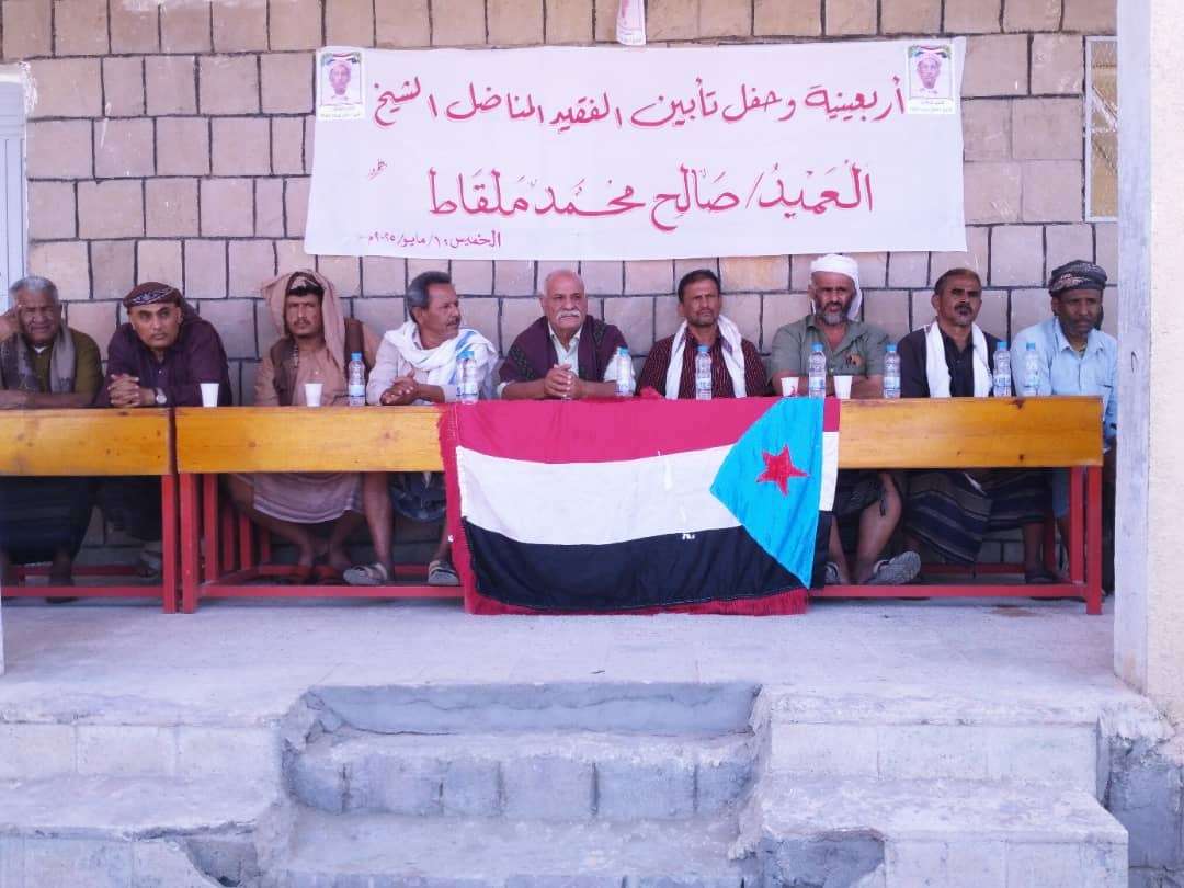 نظمت الهيئة التنفيذية للقيادة المحلية للمجلس الانتقالي الجنوبي بمديرية لودر، محافظة أبين، اليوم الخميس، حفلاً تأبينياً تكريماً للفقيد المناضل الشيخ العميد صالح محمد ملقاط، بحضور واسع من الشخصيات السياسية والاجتماعية والعسكرية والأمنية، إضافة إلى عدد من أصدقاء ومحبي الفقيد.