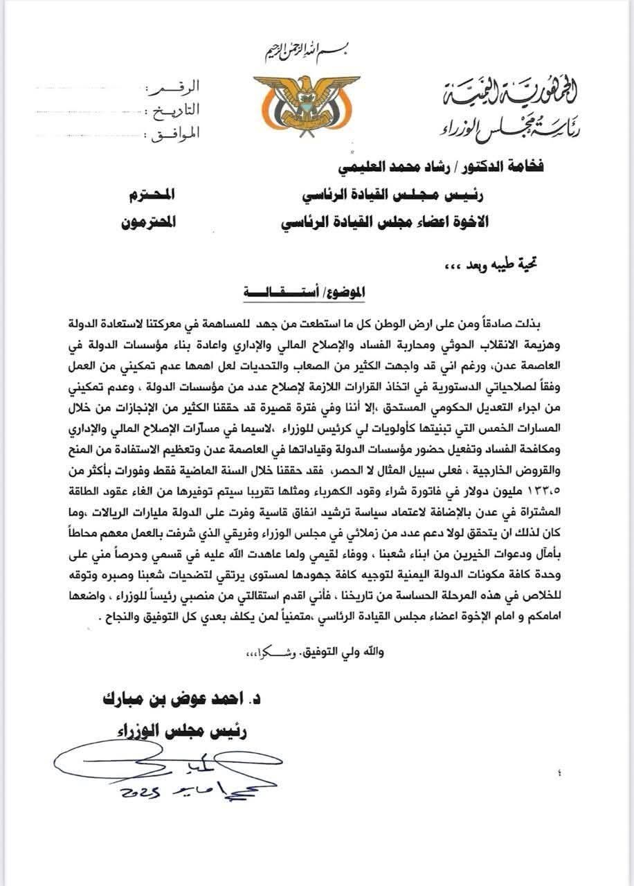 أعلن أحمد بن مبارك، رئيس مجلس الوزراء، منذ قليل، استقالته من منصبه، كرئيس للحكومة.وقال في منشور على منصة إكس “انتهيت قبل قليل من اللقاء برئيس مجلس القيادة الرئاسي الدكتور رشاد العليمي”.وأضاف “سلمته استقالتي من منصبي كرئيس للوزراء”، متبعا “اسأل الله التوفيق لمن يخلفني وأدعوا الجميع لدعمه و الالتفاف حوله للقيام بواجباته في هذا الظرف الصعب الذي تمر به بلادنا” .