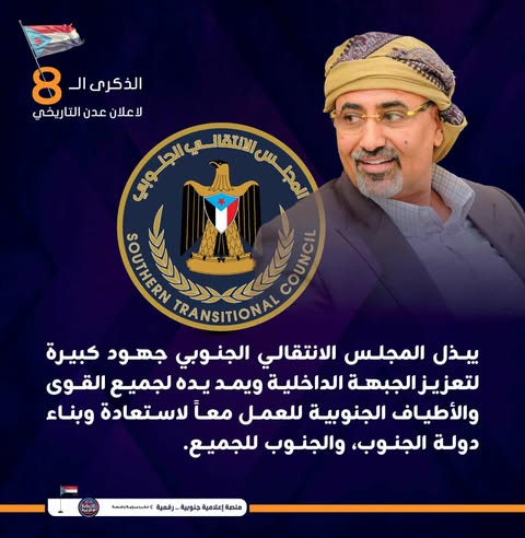 ثماني سنوات من التأسيس كانت كفيلة بأن تبرهن أن المجلس الانتقالي الجنوبي لم يكن كياناً طارئاً، بل حامل حقيقي لطموحات الجنوبيين، ومشروع وطني متكامل يرسم ملامح المستقبل، ويفتح أبواب الحلول العادلة ليس فقط للجنوب، بل للمنطقة بأسرها