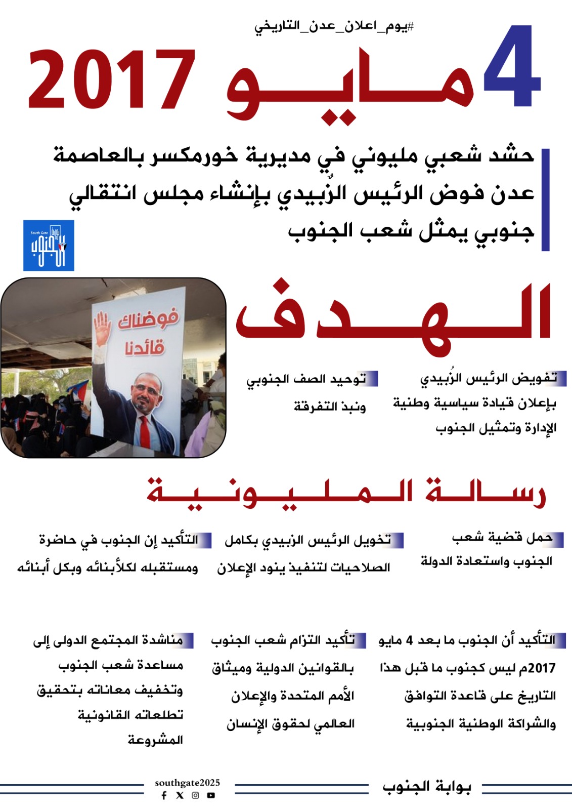 الذي صادف الرابع من مايو 2017م، انطلقت مرحلة فارقة ومفصلية في مسيرة نضال شعب الجنوب، الذي فوض الرئيس القائد عيدروس الزٌبيدي بتشكيل المجلس الانتقالي الجنوبي، الكيان السياسي المجسد لإرادة شعبنا، والمعبّر عن تطلعاته، والقائد الطليعي لثورته التحررية، وحامل لوائها.