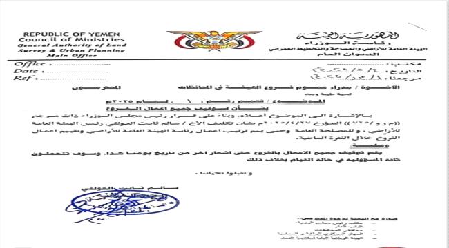 أصدر رئيس الهيئة العامة للأراضي والمساحة والتخطيط العمراني، سالم ثابت العولقي، أول قرار له عقب تسلمه مهامه رسميًا، حمل الرقم (1) لسنة 2025، قضى بتوقيف كافة الأعمال في فروع الهيئة بالمحافظات، وذلك بهدف “ترتيب أعمال رئاسة الهيئة وتقييم أداء الفروع خلال الفترة الماضية”، كما ورد في نص القرار.