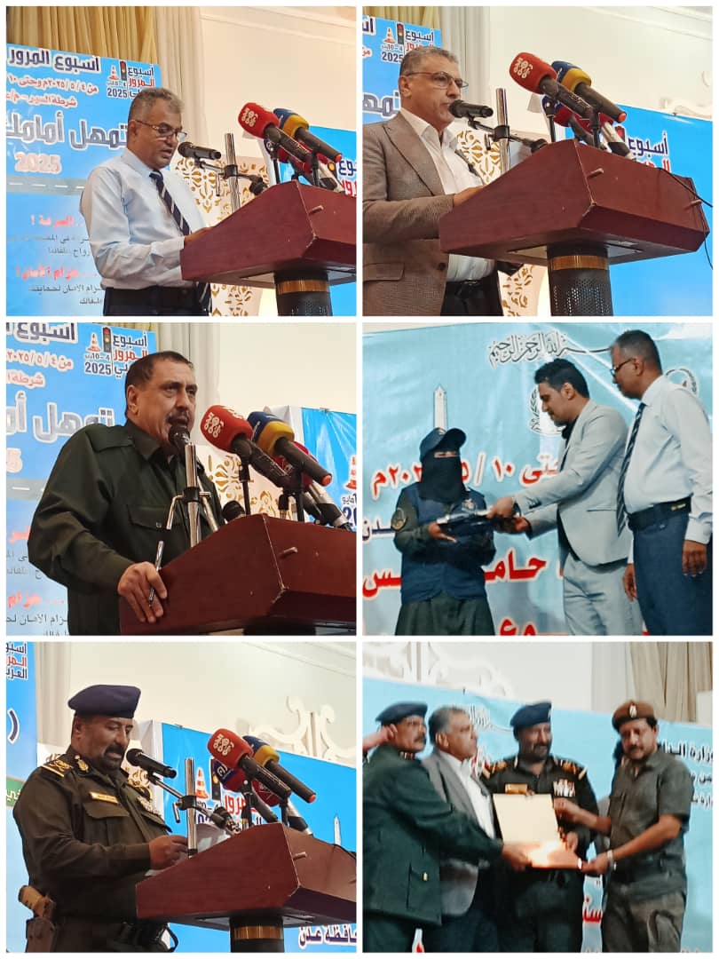 برعاية كريمة من وزير الدولة محافظ محافظه عدن احمد حامد لملس نظمت شرطة السير بالعاصمة عدن صباح اليوم حفلا خطابيا وتكريميا بمناسبة اختتام فعاليات أسبوع المرور العربي للعام 2025م والذي أقيم تحت شعار (تمهل امامك حياة )