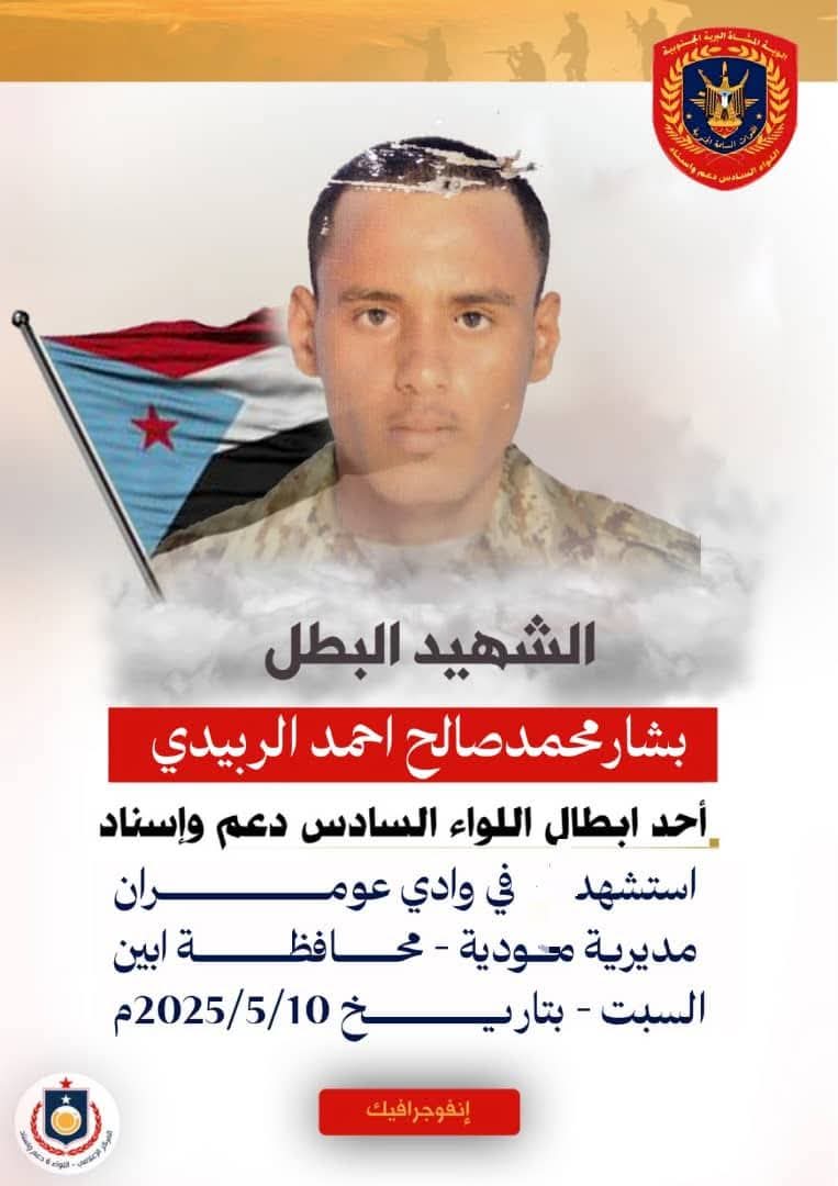 نعزي انفسنا ونعزي قيادتنا العسكريه العليا ونعزي اسرة ومحبي شهيد الواجب احد ابطال اللواء السادس دعم واسناد الشهيد” بشار الربيدي “بهذا الرحيل المبكر الذي اصابنا بالفخر والاعتزاز والحزن على مفارقه ابطال ضربوا اروع امثله الفداء والتضحيه وقدموا ارواحهم رخيصه في سبيل الدفاع عن وطنهم والسهر على حمايه آمن شعبهم ودحر وملاحقه خلايا التطرف والارهاب التي تحاول عبثآ بزعزعه امن الجنوب وارهابه .