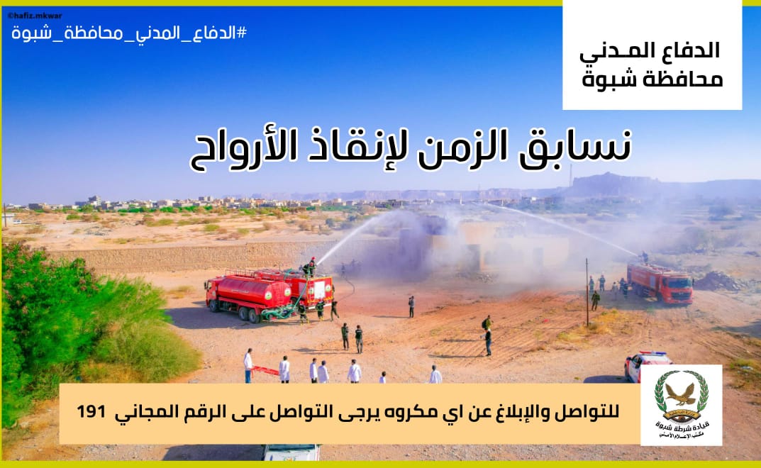 وتؤكد إدارة الدفاع المدني بمحافظة شبوة، على أن تضافر الجهود وتوفير المعلومات الدقيقة هو أمر حاسم في إدارة الأزمات، وأن فرق الدفاع المدني تواصل عملها الميداني بكفاءة ومهنية عالية لضمان أمن وسلامة جميع سكان المحافظة.