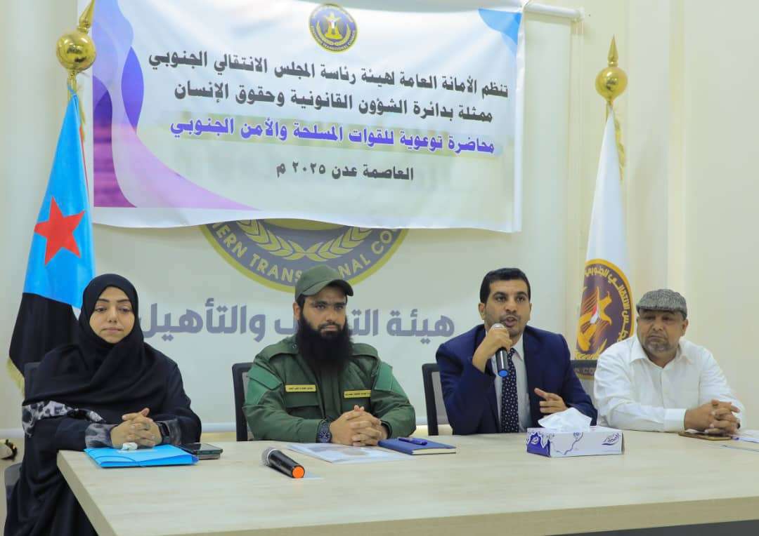 نظمت دائرة الشؤون القانونية وحقوق الإنسان في الأمانة العامة لهيئة رئاسة المجلس الانتقالي الجنوبي، اليوم الثلاثاء، محاضرة توعوية للإدارة العامة لمكافحة المخدرات في الحزام الأمني، بهدف تعزيز الوعي القانوني والحقوقي لدى أفراد الفريق، بما يسهم في أداء مهامهم الأمنية بمهنية وانضباط عالٍ.