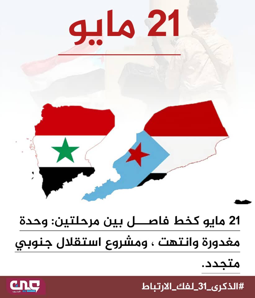بمناسبة الذكرى الـ31 لإعلان فك الارتباط، أطلق ناشطون وسياسيون جنوبيون حملة إلكترونية على مواقع التواصل الاجتماعي تحت وسم #الذكرى31لفك_الارتباط، مؤكدين أن “الوحدة” التي قامت في 1990 قد انتهت عملياً بعد حرب 1994.