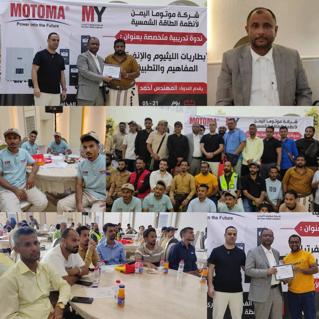 نفذت شركة موتوما اليمن لأنظمة الطاقة الشمسية صباح اليوم بقاعة الفخامة بالعاصمة عدن ندوة تدريبية متخصصة بعنوان بطاريات الليثيوم والانفرترات المفاهيم والتطبيقات، حضرها عدد من المهندسين من عدد من شركات أنظمة الطاقة الشمسية ورجال الأعمال.