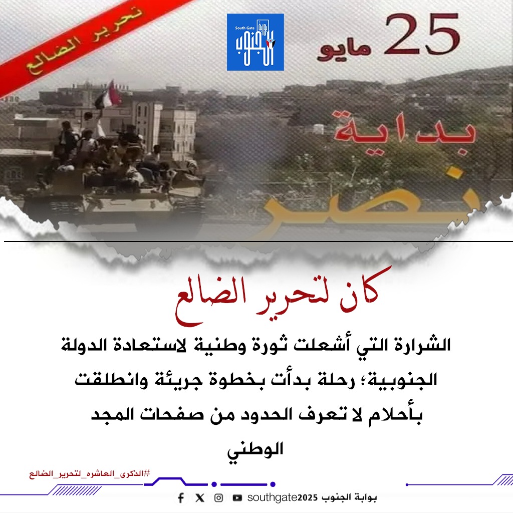 في تاريخ 25 مايو 2015م ، قبل عشرة أعوام، سطّر أبطال الضالع ملحمة تاريخية خالدة في وجه الاحتلال اليمني المتمثل بمليشيا الحوثي الإرهابية، ليعلنوا ولادة فجر جديد من أرض الجنوب، فجر نصر التحرير والعزة والكرامة. كانت الضالع أولى المحافظات التي طردت جحافل الإحتلال، لتُشعل بذلك شرارة الثورة الجنوبية، وتكون القلعة الأولى في مشروع التحرير والاستقلال.