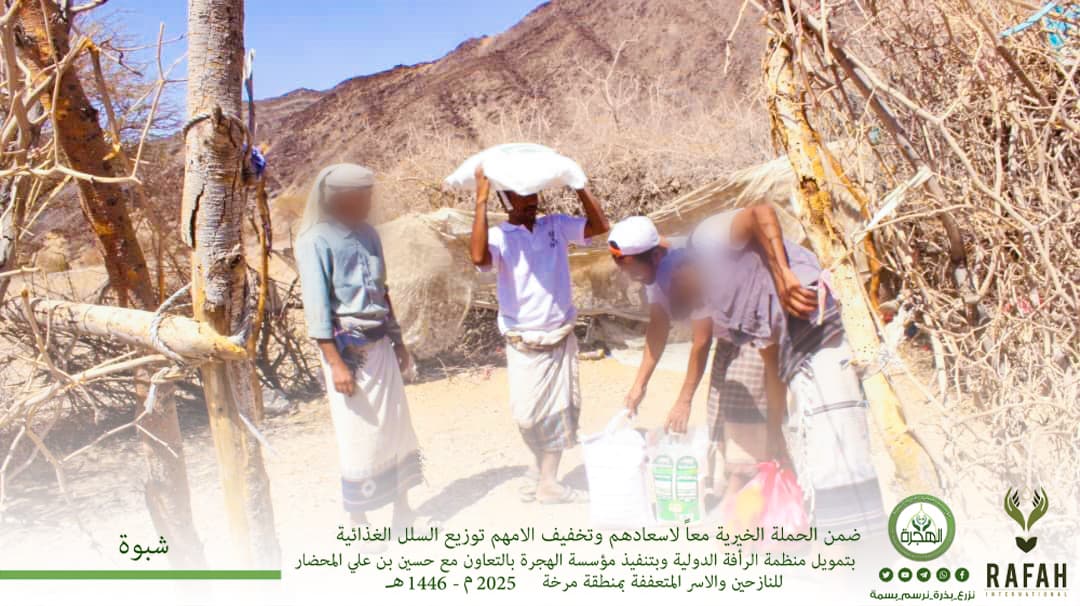 حيث نفذت مؤسسة الهجرة توزيع 140 سلة غذائية للأسر المتعففة والنازحين في بعض المناطق بمديرية مرخة بمحافظة شبوة بتمويل من منظمة الرأفة الدولية وبالتنسيق مع السيد حسين بن علي المحضار.