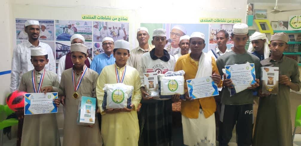 وقد أقيم حفل الختام والتكريم في صالة المنتدى بحضور السيد نزل أبوبكر المشهور رئيس مجلس مكتب الموجه العام لأربطة التربية الإسلامية ومراكزها التعليمية والمهنية وتم فيه تكريم فريق رباط المشهور الحائز على المركز الأول بالميداليات الذهبية وشهادة تقديرية وجائزة عينية كم تم تكريم فريق دار المشهور لتعليم القرآن الكريم والقراءات بأحور الحاصل على المركز الثاني وفريق مسجد جمال الدين الذي حل ثالثا حيث منحت لكل منهما شهادة تقديرية وجائزة عينية.