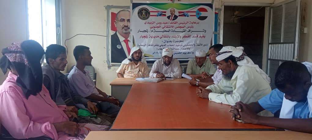 نظم قسم الفكر والارشاد بالهيئة التنفيذية للقيادة المحلية بالمجلس الإنتقالي الجنوبي مديرية زنجبار محافظة أبين، اليوم الخميس، محاضرة بعنوان “دور الأئمة والخطباء في توحيد الخطاب الديني ونشر ثقافة الوسطية والاعتدال ونبذ التطرف والارهاب ” وذلك بمشاركة عدد من ائمة وخطباء المساجد ومسؤولي الفكر والارشاد الديني في مراكز المديرية.