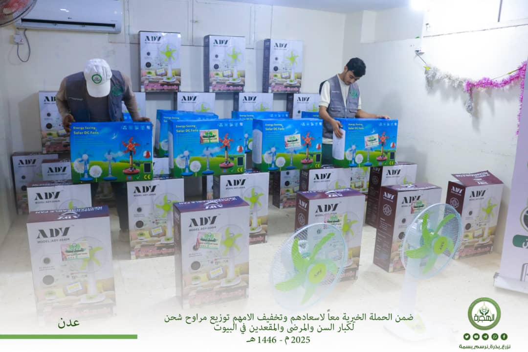 في إطار النزولات الميدانية المتواصلة للحملة السنوية (معاً لإسعادهم وتخفيف آلآمهم) للعام الحالي 1446هـ ، 2025م ، نفذت مؤسسة الهجرة الخيرية للتنمية نزولات إلى مديريات مختلفة بالعاصمة عدن ، لتوزيع أكثر من 50 مروحة شحن بتمويل سخي من فاعل خير مبارك ، تم تخصيصها لكبار السن والمرضى والمقعدين في المنازل ومخيمات النازحين من الفقراء والمحتاجين، الذين لا يملكون أي واقي يحميهم من شدة الحر، والمعاناة الشديدة من الأمراض التي يعانو منها بسبب الإنطفاءت المتكررة للكهرباء لساعات طويلة، وذلك بعد تنسيق مسبق مع مندوبي المؤسسة بتلك المناطق لمعرفة الأشخاص المحتاجين وإيصال المساعدة لهم.