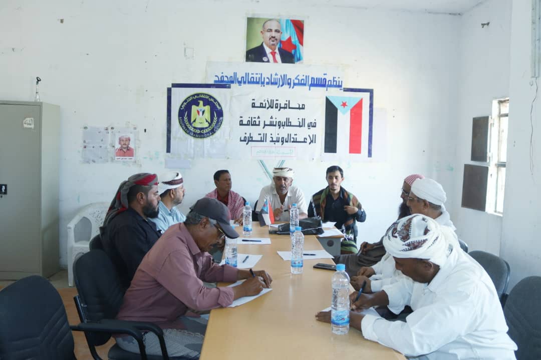 نظّم قسم الفڪر والإرشاد بالهيئة التنفيذية للقيادة المحلية بالمجلس الانتقالي الجنوبي في مديرية المحفد بأبين صباح اليوم السبت محاضرة للأئمة حول توحيد الخطاب الديني، ونشر ثقافة الاعتدال ونبذ التطرف بالمديرية