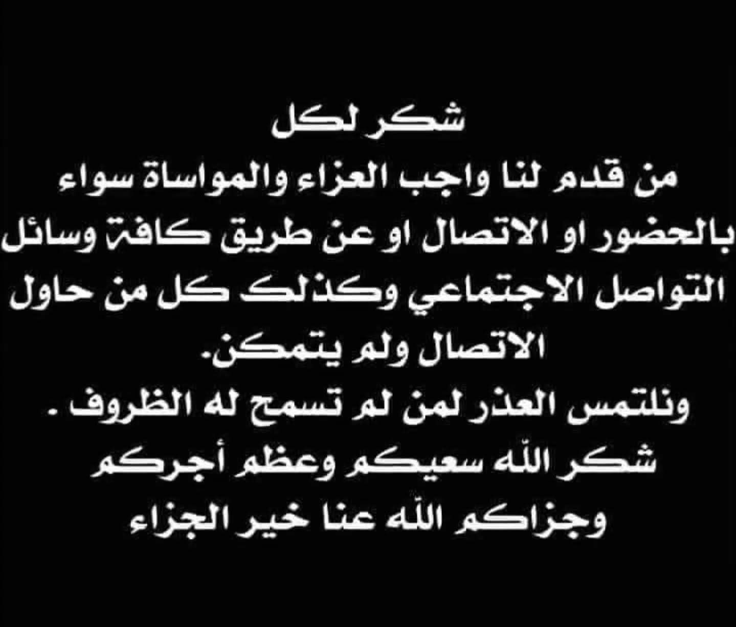 شكراً لكم اين ماكنتم في داخل الوطن وخارجه على نبل مشاعركم الإنسانية وسموا اخلاقكم الحميدة التي احتوتنا وجبرت خواطرنا وخففت عنا مرارة الحزن الذي أصابنا ولله الحمد على كل حال ولا حول ولا قوه الا بالله العلي العظيم سائلين من المولى عز وجل أن يتغمد فقيدنا بواسع رحمته ويسكنه فسيح جناته ويعصم قلوبنا بالصبر الجميل وأن يجنبنا وإياكم كل مكروة ولله عاقبة الأمور