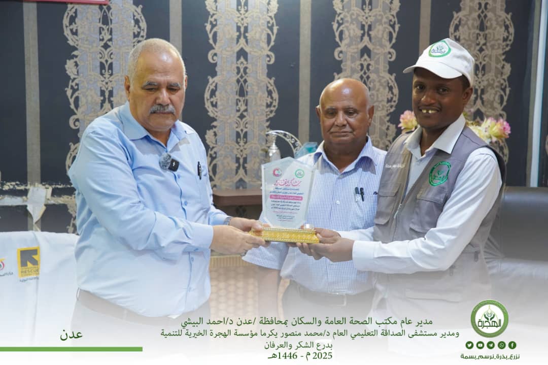 كرم مدير عام مكتب الصحة العامة والسكان بالعاصمة عدن الدكتور أحمد مثنى البيشي ومدير عام مستشفى الصداقة التعليمي العام الدكتور محمد منصور حيدرة أمس الإثنين الموافق 2 يونيو 2025م في مبنى المستشفى مؤسسة الهجرة الخيرية للتنمية ممثلة بالأستاذ علي باحميش المدير التنفيذي للمؤسسة.