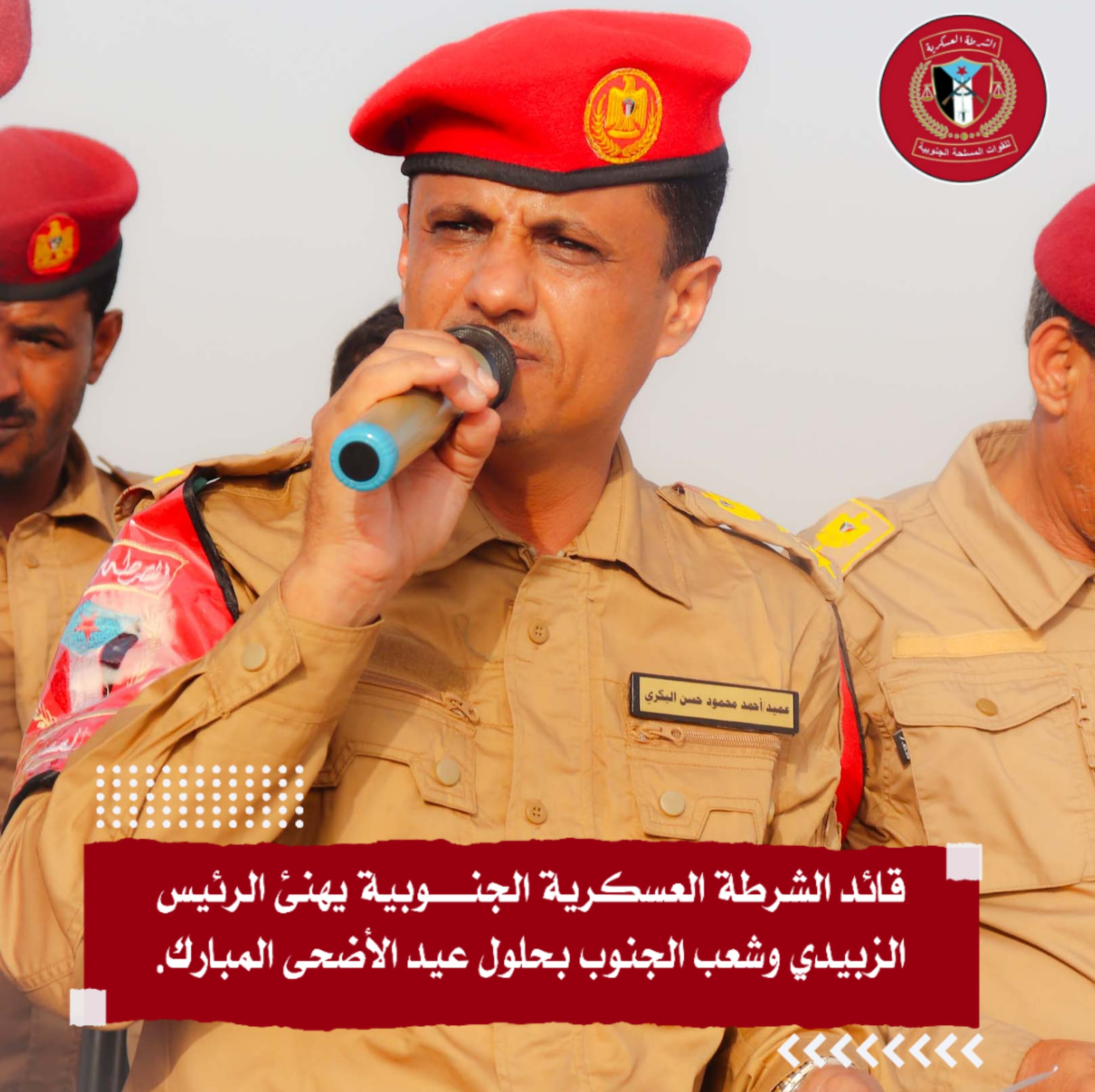 رفع العميد أحمد محمود البكري، قائد الشرطة العسكرية الجنوبية، أسمى آيات التهاني والتبريكات إلى الرئيس القائد عيدروس قاسم الزُبيدي، رئيس المجلس الانتقالي الجنوبي، القائد الأعلى للقوات المسلحة الجنوبية، وإلى أبناء شعب الجنوب الأبي، بمناسبة حلول عيد الأضحى المبارك.