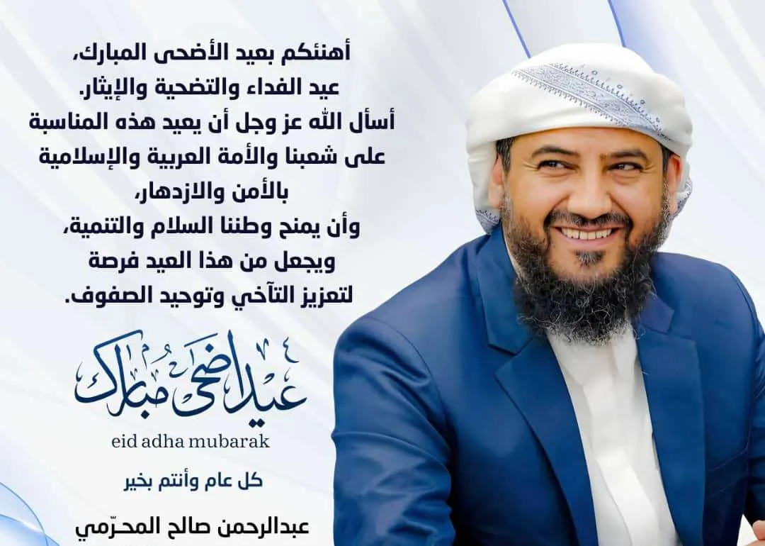 صوت الضالع / تهنئة أهنئكم بعيد الأضحى المبارك، عيد الفداء والتضحية والإيثار. أسأل الله عز وجل أن يعيد هذه المناسبة على شعبنا والأمة العربية والإسلامية بالأمن والازدهار، وأن يمنح وطننا السلام والتنمية، ويجعل من هذا العيد فرصة لتعزيز التآخي وتوحيد الصفوف. كل عام وأنتم بخير