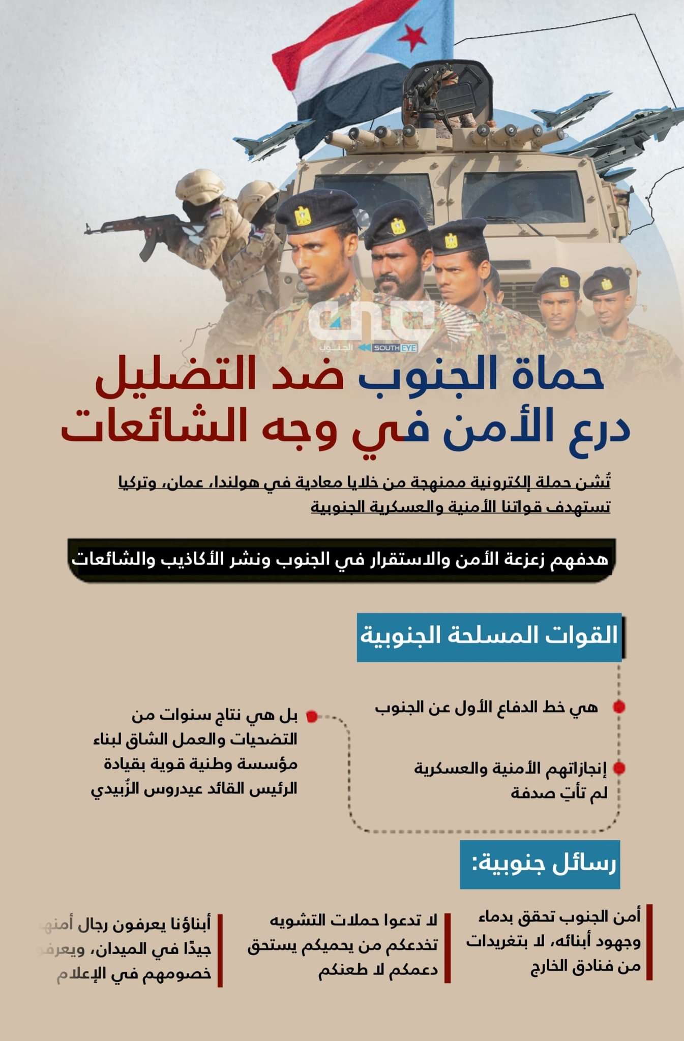 في وقتٍ تُحاك فيه المؤامرات، وتُشنّ الحملات الإعلامية المغرضة لتشويه سمعة قواتنا العسكرية والأمنية الجنوبية، نقف كالجبال الشامخة دفاعاً عن شرف الجنوب وأبطاله. القوات المسلحة الجنوبية ضحّت بالغالي والنفيس من أجل أمن الجنوبيين واستقرارهم، تستحق اليوم وغداً كل الدعم والتقدير لا التشويه والطعن من قبل أعداء الجنوب وأذنابهم ولن تستطيع ان تغير مكانتها والواقع الذي صنعته..