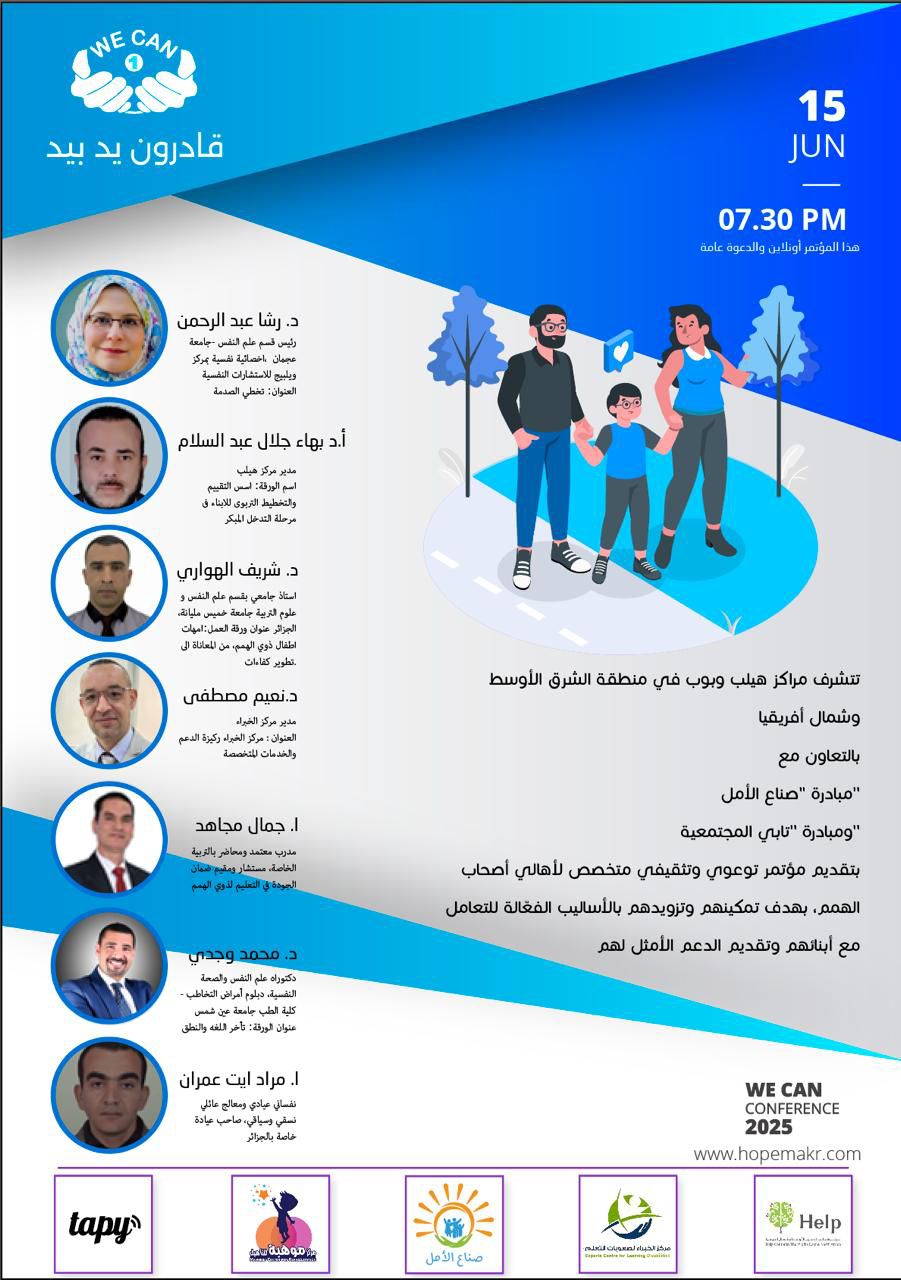 ينظم مراكز (هليب ) في منطقة الشرق الأوسط وشمال أفريقيا بالتعاون مع مبادرة صناع يوم الخامس عشر من شهر يونيو الجاري اول مؤتمر من نوعه بعنوان (قادرون يد بيد ) عبر الاون لاين (الزوم)بمشاركه نخبه من الاطباء المختصين في مجال ذوي الاعاقه واصحاب الهمم.
