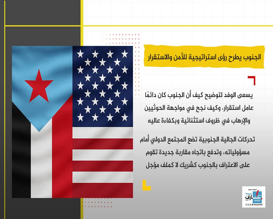 في الوقت الذي لا تزال فيه قضيتنا الوطنية السياسية والتاريخيه “قضية شعب ودولة مستقلة” بحاجة الى مساحة اوسع في السياق الدولي يواصل ابناء الجنوب ايصال صوتهم في قلب العاصمة الامريكية واشنطن حاملين معهم تطلعات شعب يتوق الى الحرية والاستقلال وبناء الشراكات النزيهة مع المجتمع الدولي