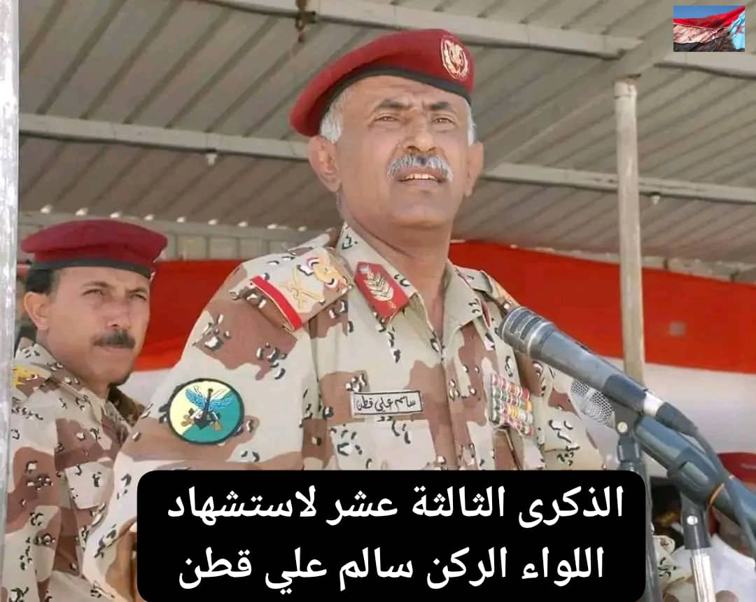 اليوم تمر علينا الذكرى الثالثة عشرة لاستشهاد اللواء الركن سالم علي قطن، القائد العسكري الذي جسّد بشجاعته وإخلاصه أسمى معاني التضحية والفداء في مواجهة واجتثاث فلول الشر والقوى الإرهابية.