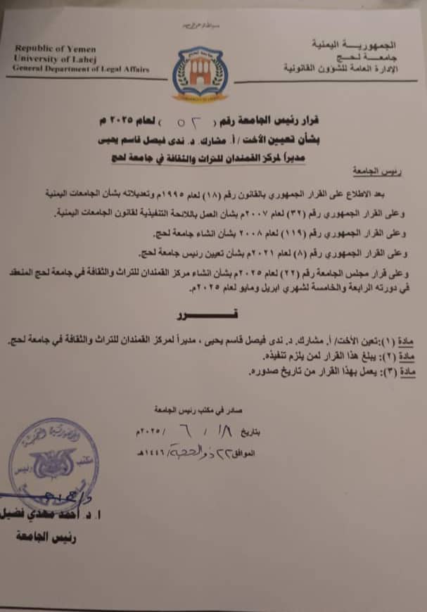 أصدر رئيس جامعة لحج، الأستاذ الدكتور أحمد مهدي فضيل، القرار رقم (53) لسنة 2025م، والذي قضى بتعيين الدكتورة ندى فيصل قاسم يحيى – أستاذ مشارك – مديرًا لمركز القمندان للتراث والثقافة في الجامعة.