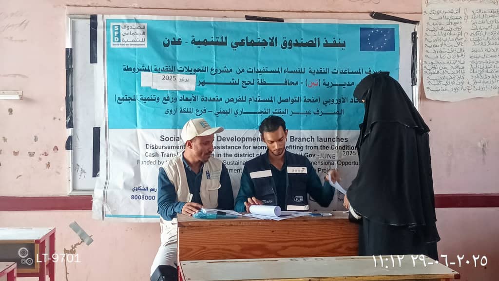 دشن اليوم في محافظة لحج صرف الدفعة السابعة من المساعدات النقدية المشروطة، ضمن مشروع التحويلات النقدية الممول من الاتحاد الأوروبي، والذي ينفذه الصندوق الاجتماعي للتنمية – فرع عدن، ويستهدف النساء من الفئات الأكثر أحتياجاً في مديرية تبن.